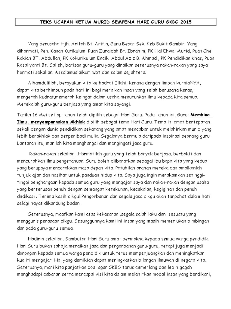 Teks Ucapan Ketua Murid Sempena Hari Guru Skbg 2015 2